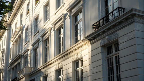 © TingYi, Naklejka premium Sunlit White Building Facade with Sharp Contrast and Texture. Perfect for: High-contrast architectural photography contests, minimalist building showcases