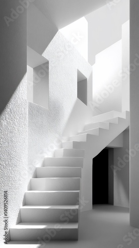 © Adobe, Fototapeta premium Sunlit white staircase ascending in a minimalist, geometric interior