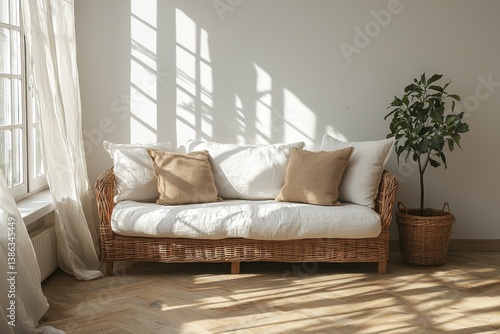 © wisnuromad art, Fototapeta premium Sunlit Wicker Sofa in a Cozy Room