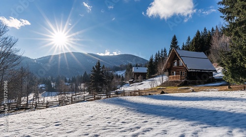 Fototapeta premium Sunlit Winter Cabin in Mountain Landscape
