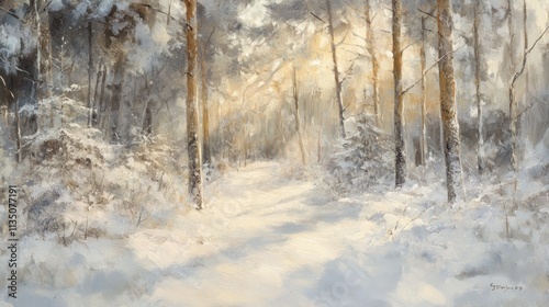 Fototapeta premium Sunlit Winter Path Through Snowy Forest