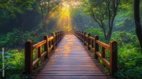 © HERMAWAN, Obraz premium Sunlit wooden bridge through lush forest