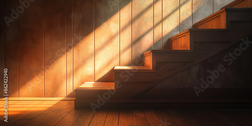 © Purple_Lamp, Obraz premium Sunlit Wooden Staircase in a Cozy Rustic Interior with Warm Natural Light