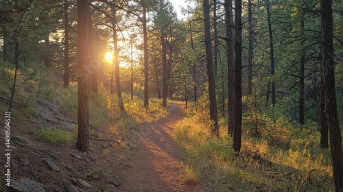 © Andi, Fototapeta premium Sunlit woodland trail winding through pine trees.
