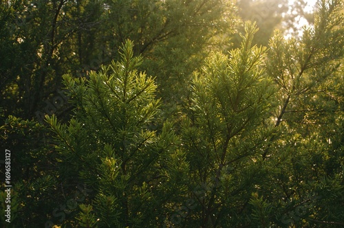 © GenZGraphics, Obraz premium Sunlit Young Cypress Branches Creating a Lush Green Backdrop