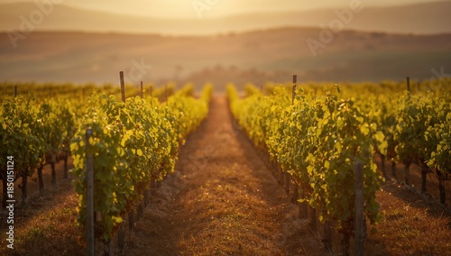 Fototapeta premium Sunlit young vineyard with thriving grape plants, highlighting farm...