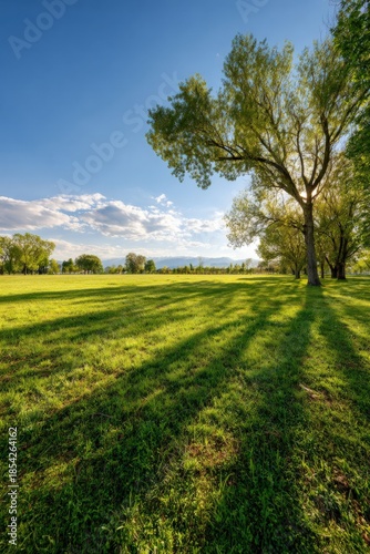 Obraz premium Sunny afternoon in a serene park with green grass and trees casting long shadows