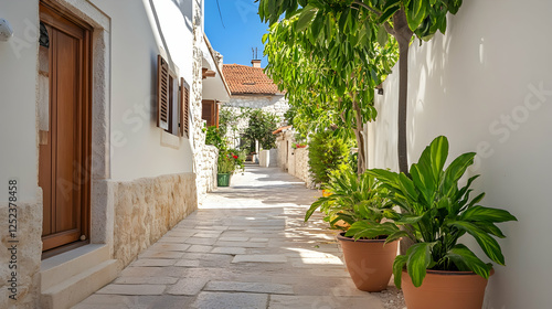 © sonswirl, Fototapeta premium Sunny alleyway between white houses with greenery. Use for travel brochure, postcard