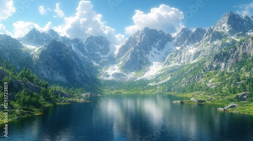 © Erisna Yolanda, Fototapeta premium Sunny alpine lake nestled in mountain valley