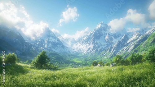 Fototapeta premium Sunny alpine valley, lush meadow, snow-capped peaks, scenic vista