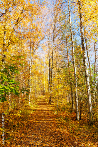 Obraz premium Sunny Autumn Forest Path Covered in Golden Leaves Lined by Tall Birch Trees -...