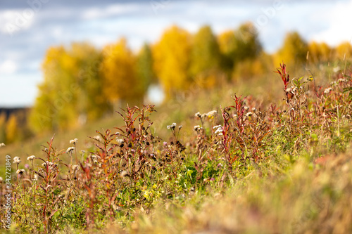© svetlanistaya, Obraz premium Sunny autumn landscape with tree at hill