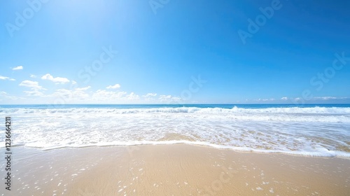 Fototapeta premium Sunny beach, ocean waves, clear sky, summer vacation background
