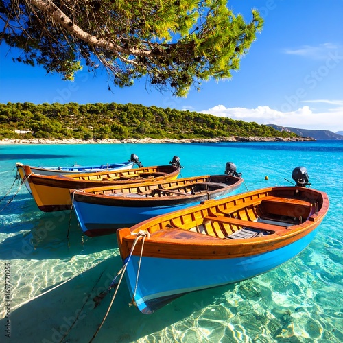 Fototapeta premium Sunny beach scene with colorful boats