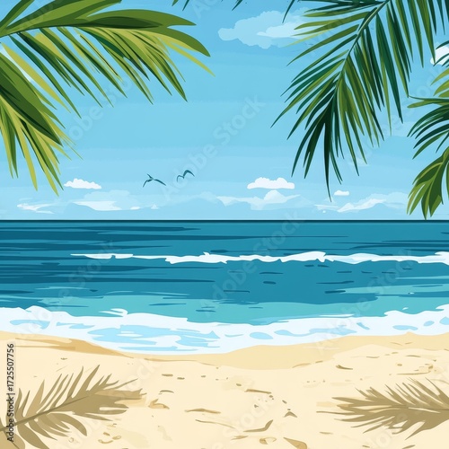 Obraz premium Sunny beach scene with sand, palm leaves, and blue sea. Perfect for summer...