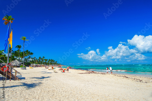 Fototapeta premium Sunny beach, white sand. Dominican Republic, Bavaro coast beach