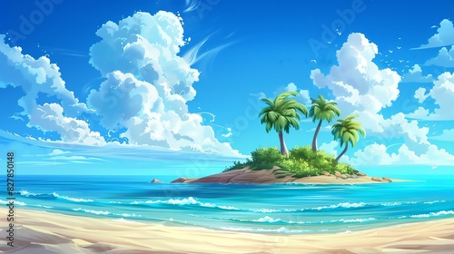 Fototapeta premium Sunny beach with palm trees and fluffy clouds.