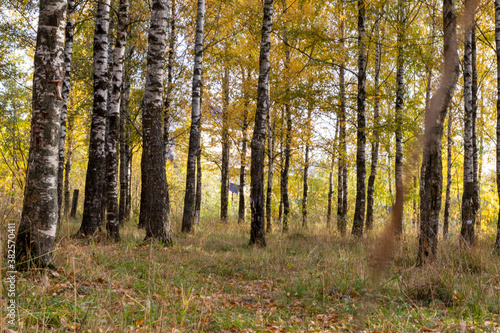 Obraz premium Sunny birch grove in the morning sun.