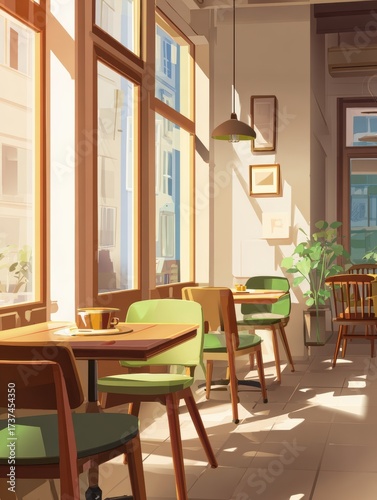 Fototapeta premium Sunny Cafe Interior with Modern Design and Warm Light