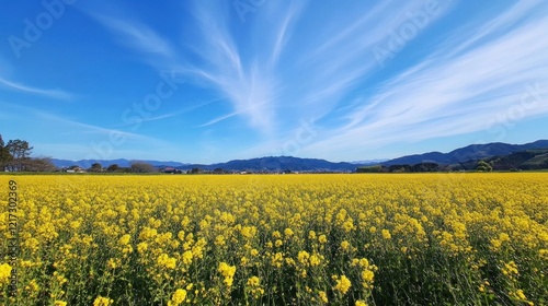 © Fenny, Fototapeta premium Sunny canola field, mountain backdrop, spring day, nature scene, travel photo