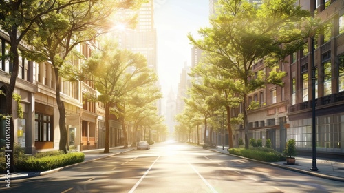 © Iswanto, Fototapeta premium Sunny City Street with Lush Green Trees and Sunlight