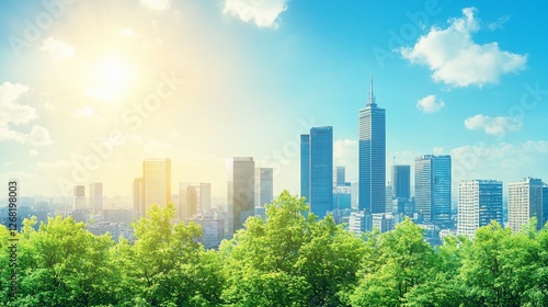 © Edi Purnomo, Fototapeta premium Sunny cityscape skyline with lush green trees.
