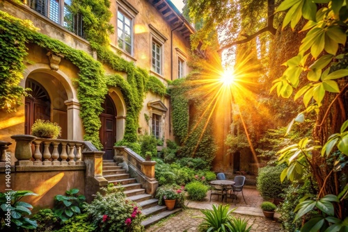 © chacoal9653, Fototapeta premium Sunny Courtyard with Stone Steps and Greenery