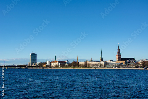 Fototapeta premium Sunny day at Riga, Latvia. Panorama of the city. Daugava river. Dome cathedral.