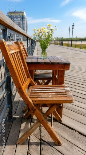 Fototapeta premium Sunny day by the river with wooden table and chairs decorated with fresh flowers in a peaceful outdoor setting