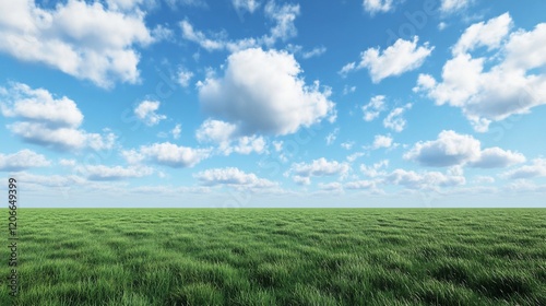 Naklejka premium Sunny day, green field, fluffy clouds, blue sky, landscape, nature, idyllic,...