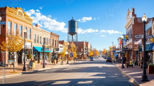 Naklejka premium Sunny Day in a Small Town with Water Tower