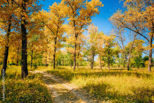 Fototapeta premium Sunny Day In Autumn Sunny Forest Trees, Green Grass. Nature Wood
