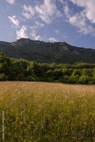 Fototapeta premium Sunny day in nature, meadow with tall grass, rocky mountains and clouds in...