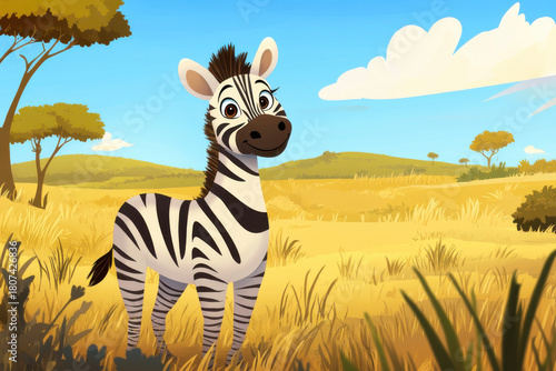 Obraz premium Sunny day in the african savanna: cartoon zebra smiling amidst dry grass,...