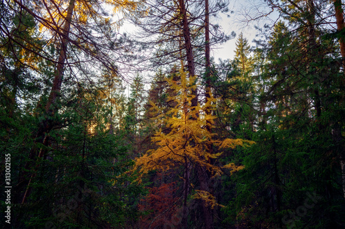 © Anatoliy, Fototapeta premium Sunny day in the autumn forest. The warm autumn sun illuminates the trunks of fir trees in a colorful autumn forest.