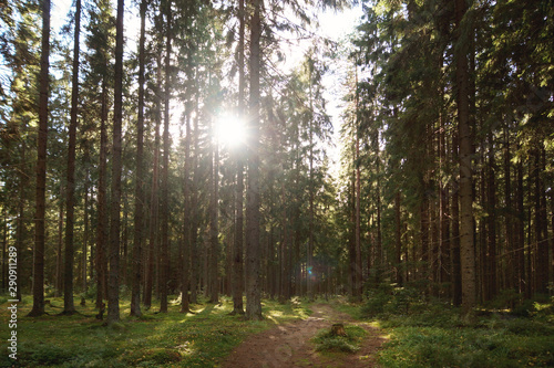 Obraz premium Sunny day in the autumn forest with tall Christmas trees and a path walking between the trees