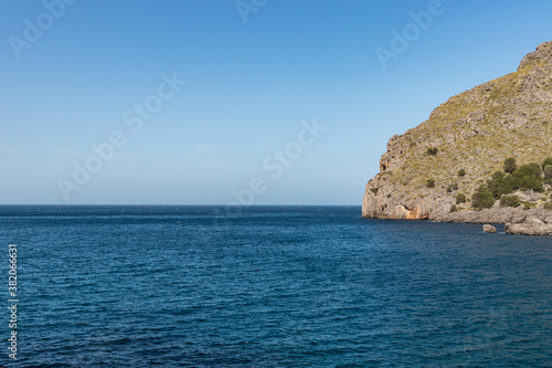 © Adelin, Fototapeta premium Sunny day over the rocks and the blue water in Sa Calobra, Palma de Mallorca, Balearic Islands, Spain