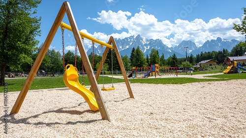 © Nutty, Fototapeta premium Sunny Day Playground Fun Mountain View Childrens Swings Slide Alpine Landscape