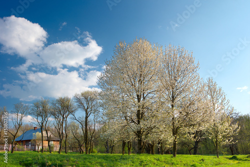 © pyvovarpavlo, Fototapeta premium sunny day, trees covered with white blossoms
