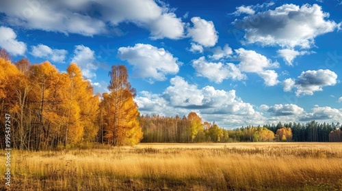 Fototapeta premium Sunny day view of autumn forest and field with clouds