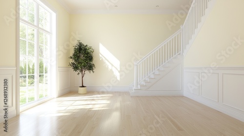 © danadesa, Obraz premium Sunny Entryway with Stairs, Plant, Hardwood Floor