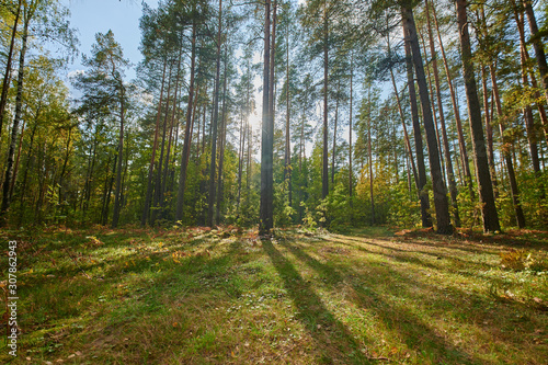 © Photo, Obraz premium Sunny european forest landscape on a summer day with green trees