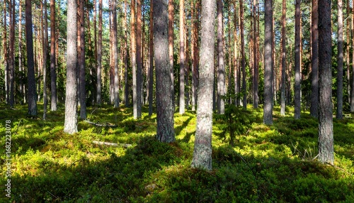 © Dida, Fototapeta premium Sunny forest floor with tall pine trees