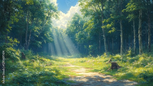 © Erisna Yolanda, Obraz premium Sunny forest path, sunlight beams through trees