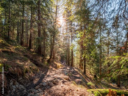 Fototapeta premium Sunny Forest path way to the Herzogstand peak of Bavaria