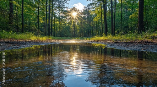 Obraz premium Sunny Forest Puddle Reflection Pathway