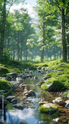 © ika, Fototapeta premium Sunny forest stream path, tranquil nature scene
