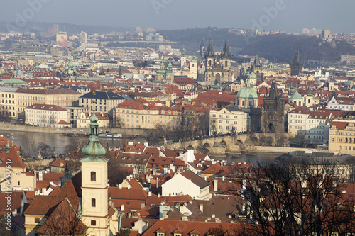 © Kajano, Fototapeta premium Sunny freezy winter Prague City z katedrami, zabytkowymi budynkami i wieżami w Czechach