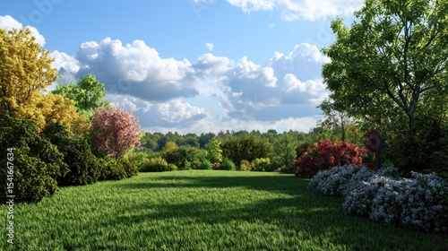 Obraz premium Sunny garden landscape with vibrant flowers and trees