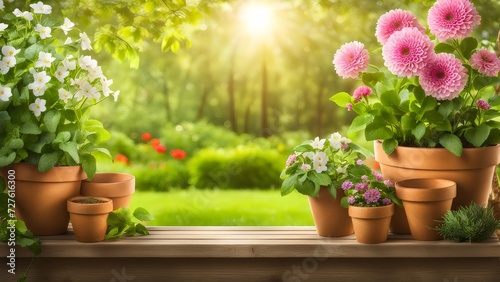Obraz premium Sunny garden scene with flowerpots, perfect backdrop for vibrant spring or...